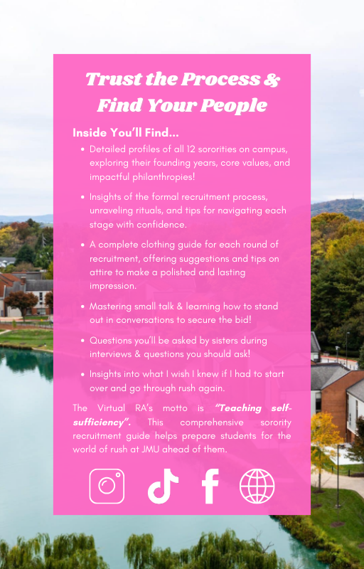 You'll get a 78-page E-book and reference manual which includes content on Sorority Recruitment at JMU. Detailed profiles of all 12 sororities on campus, exploring their founding years, core values, and impactful philanthropies! Insights of the formal recruitment process, unraveling rituals, and tips for navigating each stage with confidence. A comprehensive clothing guide for each round of recruitment, offering suggestions and tips on attire to make a polished and lasting impression. Mastering small talk & learning how to stand out in conversations to secure the bid! Questions you’ll be asked by sisters during interviews & questions you should ask! Packing your recruitment survival bag! Insights into what I wish I knew if I had to start over and go through rush again.